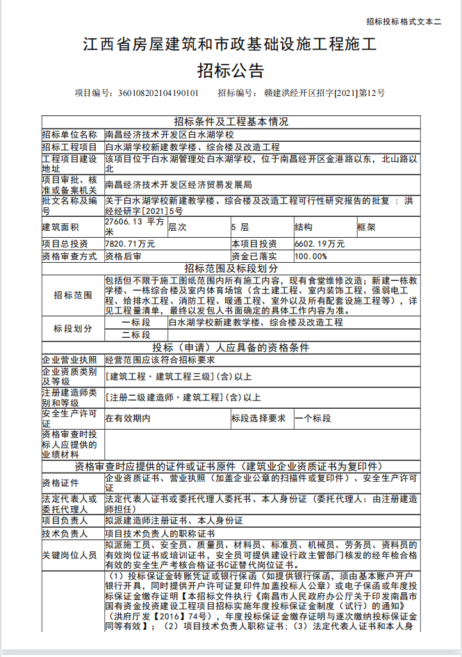 首頁(yè) > 招標(biāo)公告 > 招標(biāo)公告 > 白水湖學(xué)校新建教學(xué)樓、綜合樓及改造工程招標(biāo)公告