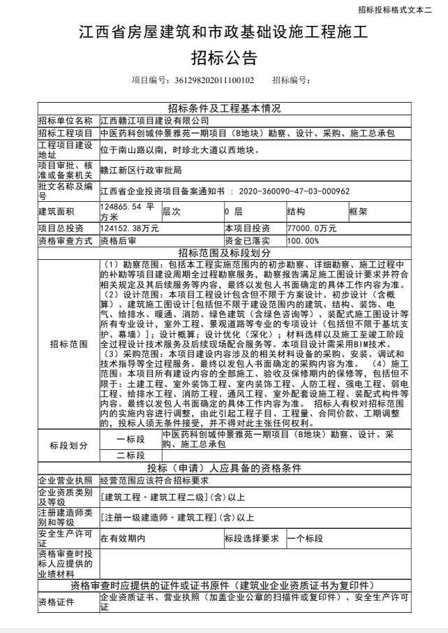 首頁 > 招標(biāo)公告 > 招標(biāo)公告 > 中醫(yī)藥科創(chuàng)城仲景雅苑一期項目(B地塊)勘察、設(shè)計、采購、施工總承包招標(biāo)公告
